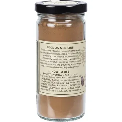 Peruvian Cacao Powder*, Medicinal Mushroom Complex 20% [(Cordyceps, Lion’s Mane, Reishi, Chaga) 1:20 Extract], Cinnamon*, Mesquite*, Maca*, Rhodiola*. *Certified Organic Ingredient