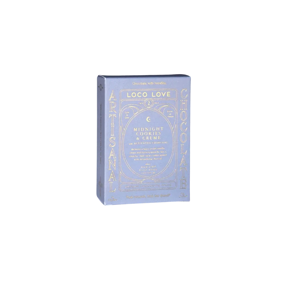 Savour the perfect balance of indulgence and purity with this Midnight Cookies & Creme. Delicate layers of soft vanilla creme, gluten-free chocolate cookie, and buttery textured ganache, all topped with a shimmering starry sky of detoxifying activated charcoal. This exquisite layered chocolate creation is your answer to mindful bliss, a reminder of nature’s magic in every bite. Perfect for those who seek both pleasure and purity in every bite, this treat promises an experience that's as delightful as it is beneficial.